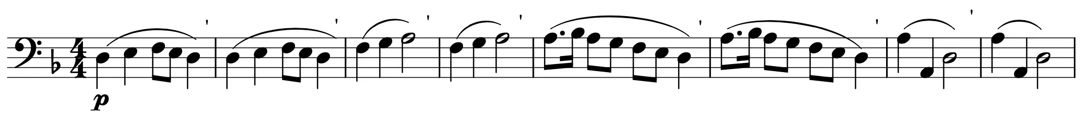 第1楽章と同様、4度の下降音型を基調とした冒頭である。独奏コントラバスが奏でる重々しく哀愁を帯びた旋律(譜例3)がカノン風に展開される。この旋律は世界各地で知られるフランス民謡《フレール・ジャック》(日本では《グーチョキパーでなにつくろう》)を短調にしたものであり、グロテスクなだけでなくどこかパロディックな側面も感じさせる。奇怪な進行が続いたのち、突如ヴァイオリンによる牧歌的で安らかな旋律がはじまる。《さすらう若人の歌》第4曲<彼女の青い目が>の最後の部分であり、安らかな眠り、すなわち死を暗示している。