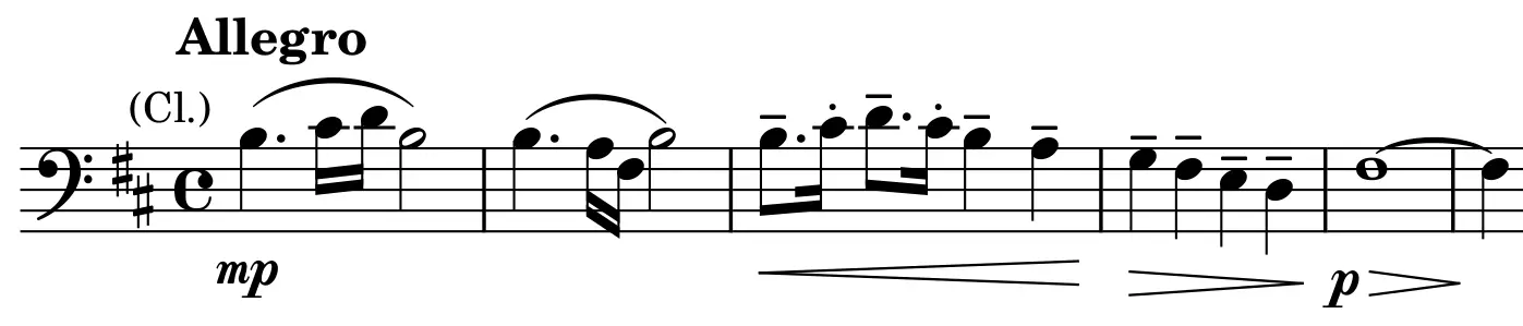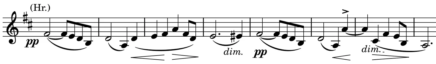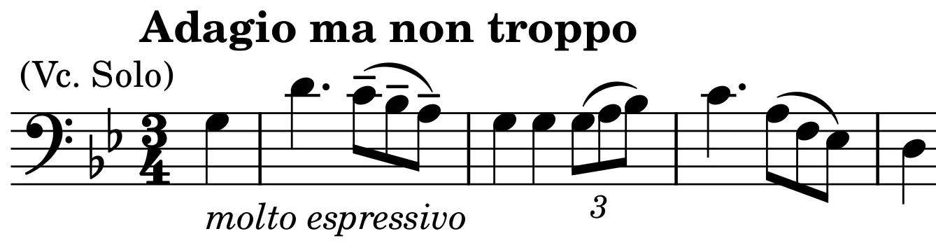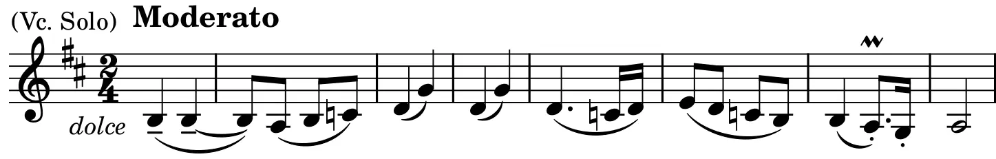 ト長調-ト短調-ト長調の三部形式をとる。第一部は牧歌的な主題で穏やかに進むが、突然激しい曲想の第二部へとドラマティックに移行する。独奏チェロが奏する第二部の主題(譜例3)は、かつて彼が恋したヨゼフィーナへの深い哀悼の調べとして、彼女の愛唱歌である《4つの歌曲》作品82の第1曲<ひとりにして>にもとづいたものとなっている。第三部はホルンによる第1主題の再現で始まり、独奏チェロのカデンツァ風の変奏を経て、消えるように閉じられる。