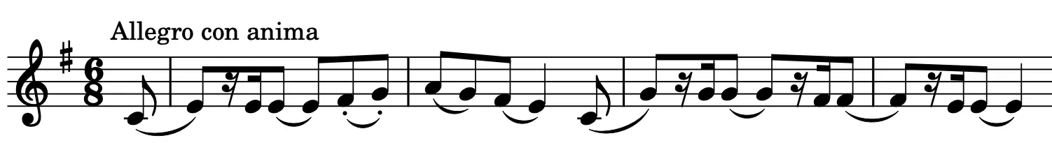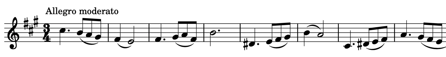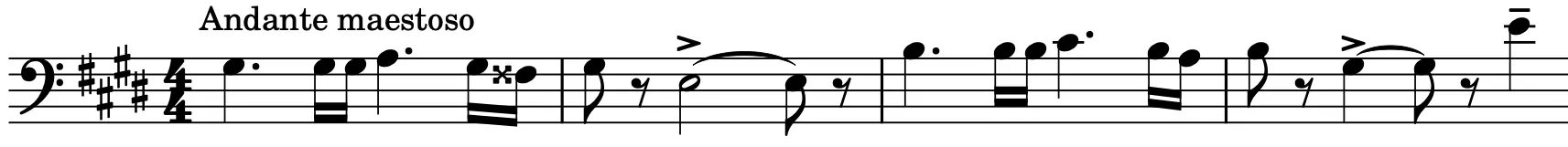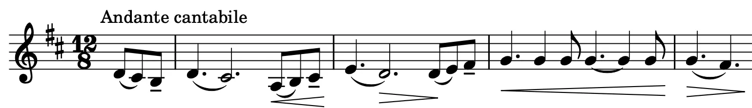 ホルンが甘美で抒情的な主題を奏でることで主部が始まる(譜例2)。まさに“音階を音楽に昇華した”旋律美にクラリネットの対旋律が加わり、続いてオーボエとホルンが副次テーマを多声的に奏でる。中間部ではややテンポが上がり、クラリネットによる郷愁漂う主題がファゴット・オーボエへと引き継がれる。やがて激しい盛り上がりと共に「運命の主題」が出現すると、休止のフェルマータを挟み主部の再現へと至る。感情が昂り𝆑𝆑𝆑𝆑の頂点を迎えると唐突に「運命の主題」が強奏されるが、コーダでは落ち着きを取り戻し静かに楽章が締めくくられる。