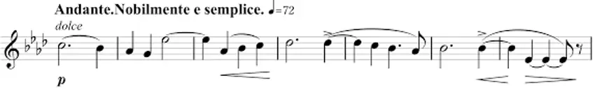 一方で、ドイツ的交響曲の系譜に数えられたからと言って、それはこの第一交響曲がイギリスらしさ、エルガーらしさを失ったことを意味するわけではない。第一楽章の冒頭、序章で現れるモットー主題(譜例)を聴けば、かの有名な威風堂々第一番のトリオと同じような、エルガー的雄大さと気品に満ちあふれた旋律が、春を知らせる風のように鮮やかに、そして自然に体に広がる。モットー主題というのは循環主題とも呼ばれ、ベルリオーズの「幻想交響曲」における「彼女の主題」のように、曲を通じて演奏される旋律を意味する。そこに付記されている「高貴かつ素朴に」というのはエルガーが好んで用いた演奏指示で、この旋律がいかにもエルガー的であることを裏付ける事実である。