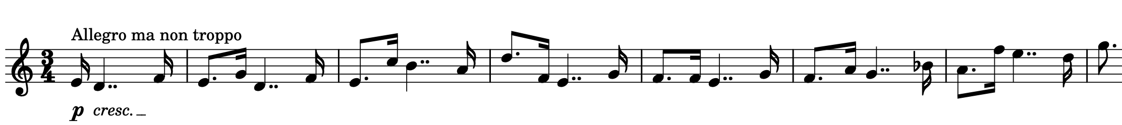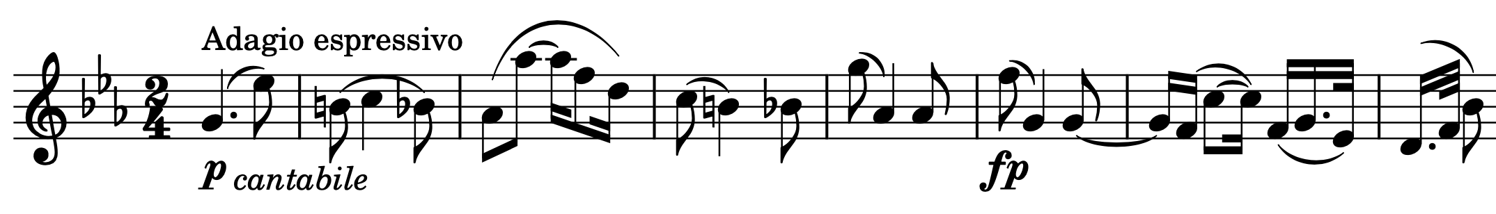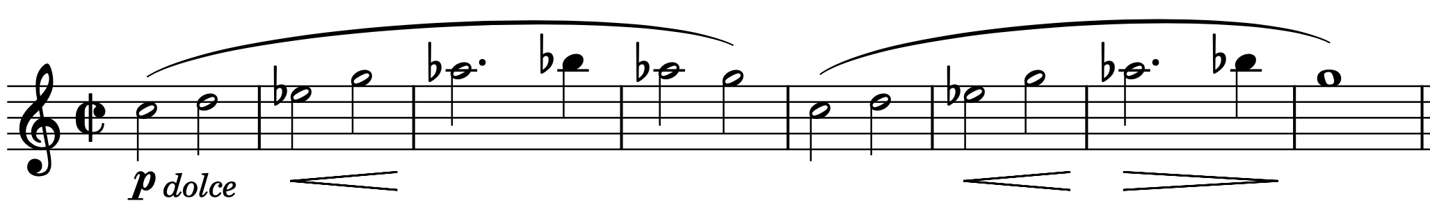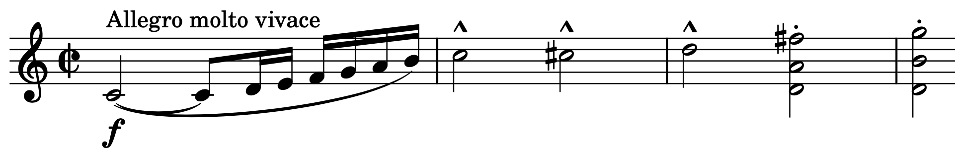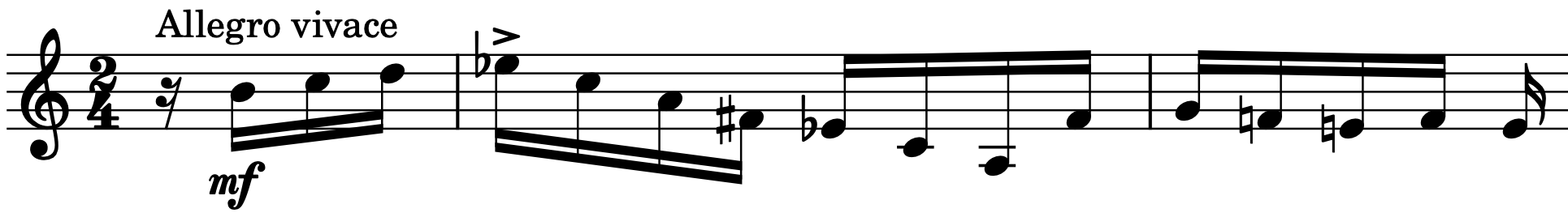 第1トリオでは管楽器の3連音楽句が、第2トリオでは4分音符を主体とした牧歌的で落ち着いた旋律が奏でられる。最後のコーダも16分音符で締められるが、第1楽章冒頭のモットー(譜例1)が再度現れる点にもご注目いただきたい。